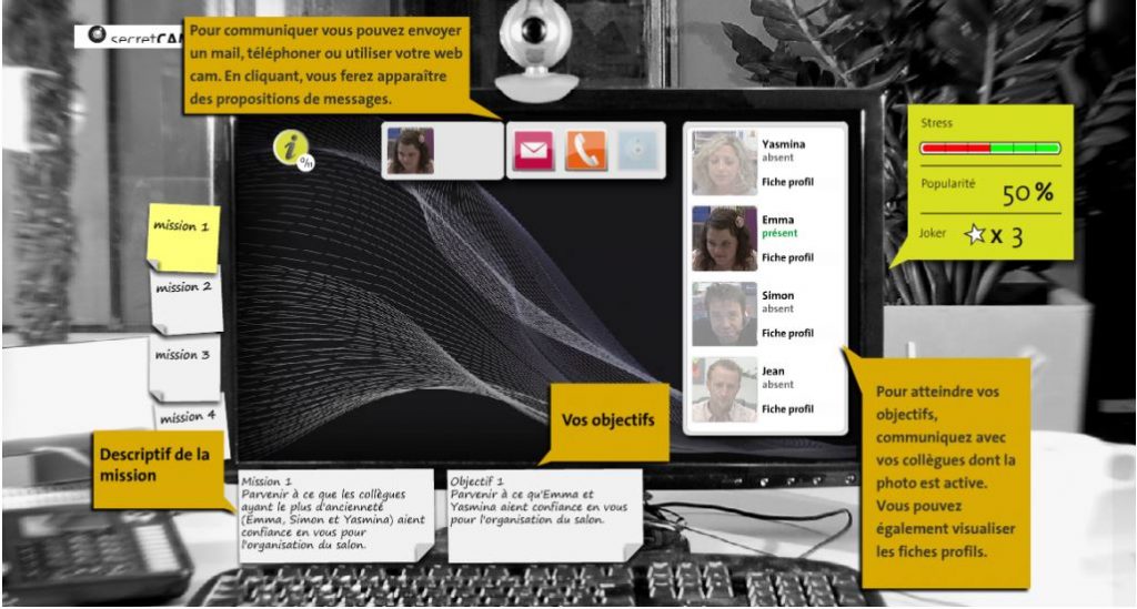 Conçu par la Cnam Pays de la Loire et avec l’aide de 18 partenaires, Secret Cam met en place de nombreuses scénettes filmées dans lesquelles le joueur intègre la peau d’un salarié d’une petite entreprise. Son équipe est composée d’un collègue atteint d’un handicap invisible et, au fur et à mesure de l’histoire, le joueur doit régulièrement faire un choix entre plusieurs propositions comportementales. Des décisions qui auront une incidence sur la progression dans le jeu, et donc sur la réussite du joueur.