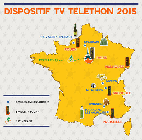 L’émission diffusée en directe est tournée dans la capitale mais de nombreux événements sont organisés sur toute la France pour récolter des dons à cette occasion. Même dans les plus petites communes de France, on dénombre des actions diverses et variées en faveur du Téléthon. On ne compte plus les lotos, tombolas, courses, repas et autres animations mises en place pour faire participer les gens de tous horizons et de tous lieux à cette nouvelle édition du Téléthon.