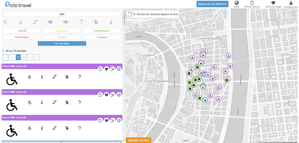 Picto travel est un service récemment mis en ligne, qui a pour objectif de référencer les adresses et services accessibles en France. S’il n’y a là rien de très novateur, notez quand même que vous pouvez trouver actuellement presque 100 000 adresses d’activités, commerces, hébergements, restaurants, services ou transports sur le site, ce qui constitue déjà une belle performance.