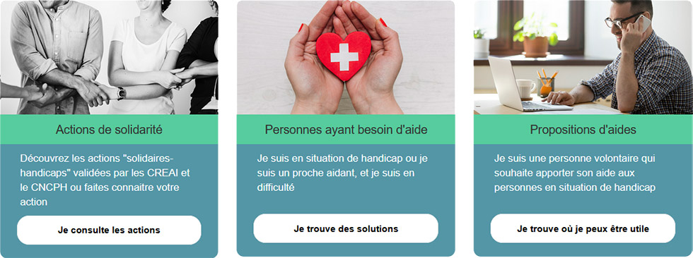 Le site Solidaires-handicaps.fr propose une mise en relation des personnes en situation de handicap, de leurs aidants ou des professionnels de santé avec l’ensemble des dispositifs d’accompagnement et d’appui dont ils peuvent profiter, alors qu’ils n’en connaissent pas forcément l’existence.