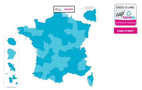 Handéo propose sur son site une carte de France (qui inclut également les territoires d’Outre-Mer) et regroupe ainsi les différentes coordonnées des prestataires de services répondant aux critères imposés par au moins un label Cap’Handéo. En sélectionnant le département souhaité, vous obtenez une liste avec les coordonnées principales. Et en cliquant sur le nom de l’enseigne, vous ouvrez sa fiche détaillée. Cette dernière présente les différents services proposés ainsi que les types de handicap qui peuvent être accompagnés. Selon les enseignes, cette fiche peut également comporter un lien vers le site internet, télécharger une fiche de présentation ou de renseignement, …