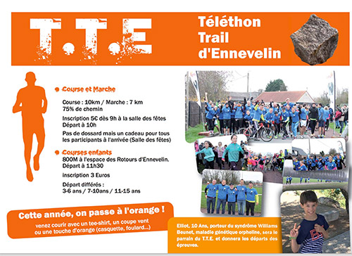 Si vous habitez dans le Nord, inscrivez-vous au Téléthon Trail d’Ennevelin en envoyant votre bulletin d’inscription ainsi que votre règlement à la Mairie d’Ennevelin, place Jean Moulin, 59710 Ennevelin. Votre chèque (3 € par enfant, 5 € par adulte) est à libeller à l’ordre de l’AFM Téléthon et vous pouvez télécharger le bulletin d’inscription en cliquant ici : Bulletin d’inscription TTE.
