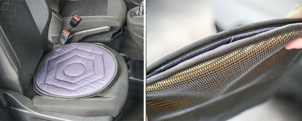Cependant, ces derniers mois nous nous sommes rendus compte (grâce à vous) que cet accessoire avait certaines limites qui le rendait inutilisable (dans certains cas seulement) : en fonction de votre morphologie, de l’endroit où vous utilisiez le coussin ou encore la fréquence, la housse (très souple) glissait et ne permettait plus le maintien du coussin sur son socle, rendant donc l’ensemble inutilisable. Ou encore, la base étant rigide et votre siège un peu baquet et étroit, il vous était impossible de l’utiliser correctement en voiture sans risquer de l’abîmer.