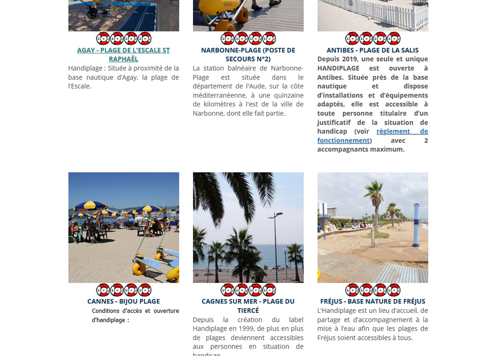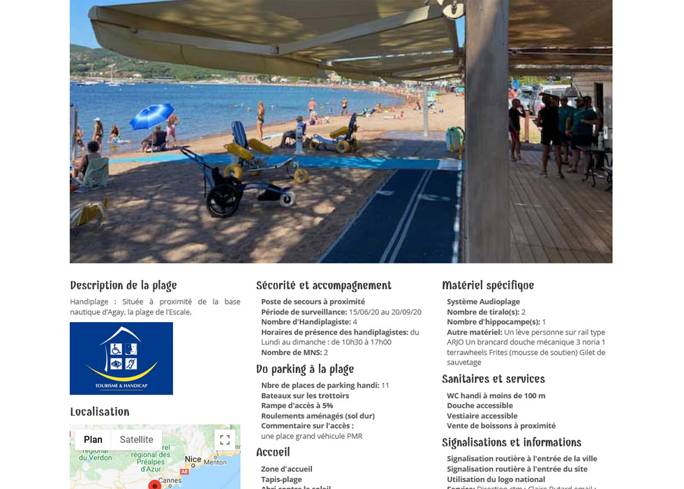 Prenons l’exemple d’une plage classée label Handiplage 4 : « Agay – plage de l’escale St Raphaël ». Sur la page en question, on y retrouve autant de renseignements :