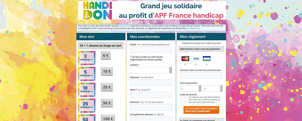 Et au-delà de l’éventuel cadeau reçu si vous êtes tiré au sort, cette opération vous permet de gagner… sur vos impôts ! En effet, si Handidon s’apparente à un jeu concours, votre participation est bel et bien considérée comme un don et donne droit de ce fait à un crédit d’impôts. A la validation de votre don, vous recevrez un reçu fiscal vous permettant de déduire 66% du montant de votre don de votre impôt sur le revenu.