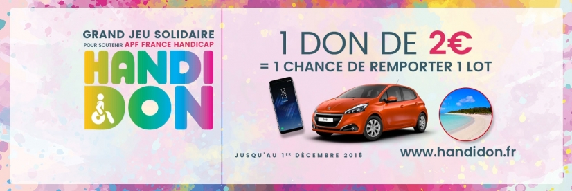 Pour innover et inciter le grand public à venir en aide aux personnes fragilisées, en 2014 l’APF France Handicap a eu l’idée de créer un jeu concours pour récolter des fonds. Face au succès de la première édition, les organisateurs ont renouvelé l’opération chaque année depuis. Cette dernière a lieu en fin d’année et prend la forme d’une tombola. Vous en avez peut-être déjà entendu parler, elle s’appelle Handidon. La cinquième édition d’Handidon est d’ores et déjà lancée, depuis le 1er septembre, et vous avez jusqu’au 1er décembre pour y participer !