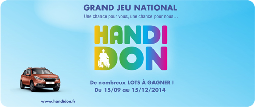Handidon est donc une grande collecte de dons qui se déroule du 15 septembre au 15 décembre 2014. Il s’agit en fait d’un grand jeu concours qui vous invite à acheter des « tickets » pour participer. A l’issue du jeu, un tirage au sort sera réalisé au siège de l’APF pour désigner les gagnants de lots particulièrement alléchants : une voiture, des séjours de vacances, des home cinémas, des tablettes numériques, …