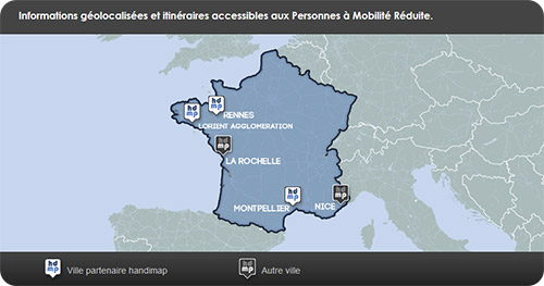 Après Rennes, ce sont les villes de Montpellier, Nice, La Rochelle et même l’agglomération élargie de Lorient qui ont bénéficié de l’expertise des fondateurs d’Handimap. Il est ainsi possible dans chacune de ces villes de calculer des itinéraires de déplacements en fonction du type de handicap rencontré. Ce service innovant se montre particulièrement efficace. Les itinéraires se calculent très rapidement, affichent des parcours les plus accessibles possibles et peuvent même être téléchargés sur des GPS ou des téléphones mobiles compatibles…