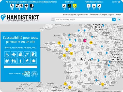 Ce slogan qui trône fièrement sur la page d’accueil d’Handistrict en dit long. Ce nouveau site Internet vient tout juste d’être dévoilé, et a pour but de référencer partout en France les lieux accessibles aux personnes à mobilité réduite. Mais, ce n’est pas ce que fait déjà Jaccede ? Si, à la différence près que Jaccede prend en compte principalement le handicap moteur, tandis qu’Handistrict référence les lieux en fonction de leur accessibilité à tous les types de handicap.