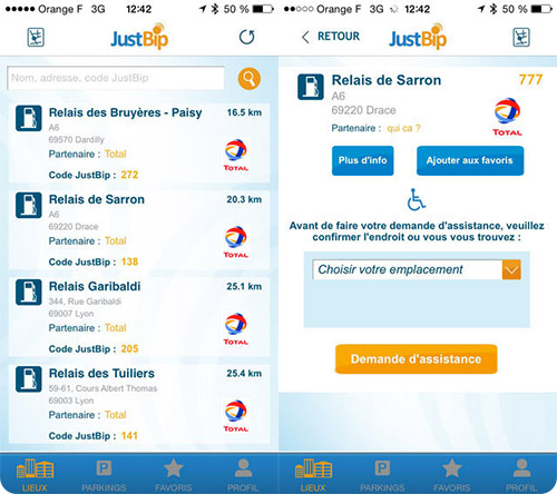 C’est le réseau de stations services Total qui est le mieux référencé, puisque l’application JustBip Assistance compte à ce jour 160 stations dans lesquelles il est possible de faire appel à une aide extérieure. Concrètement, en arrivant dans une station service Total, il suffit de s’arrêter devant une pompe puis de relever le numéro JustBip Assistance qui figure sur un autocollant bien visible. En lançant l’application sur le smartphone, vous êtes invité à renseigner ce numéro puis l’application prévient immédiatement le personnel de la station.