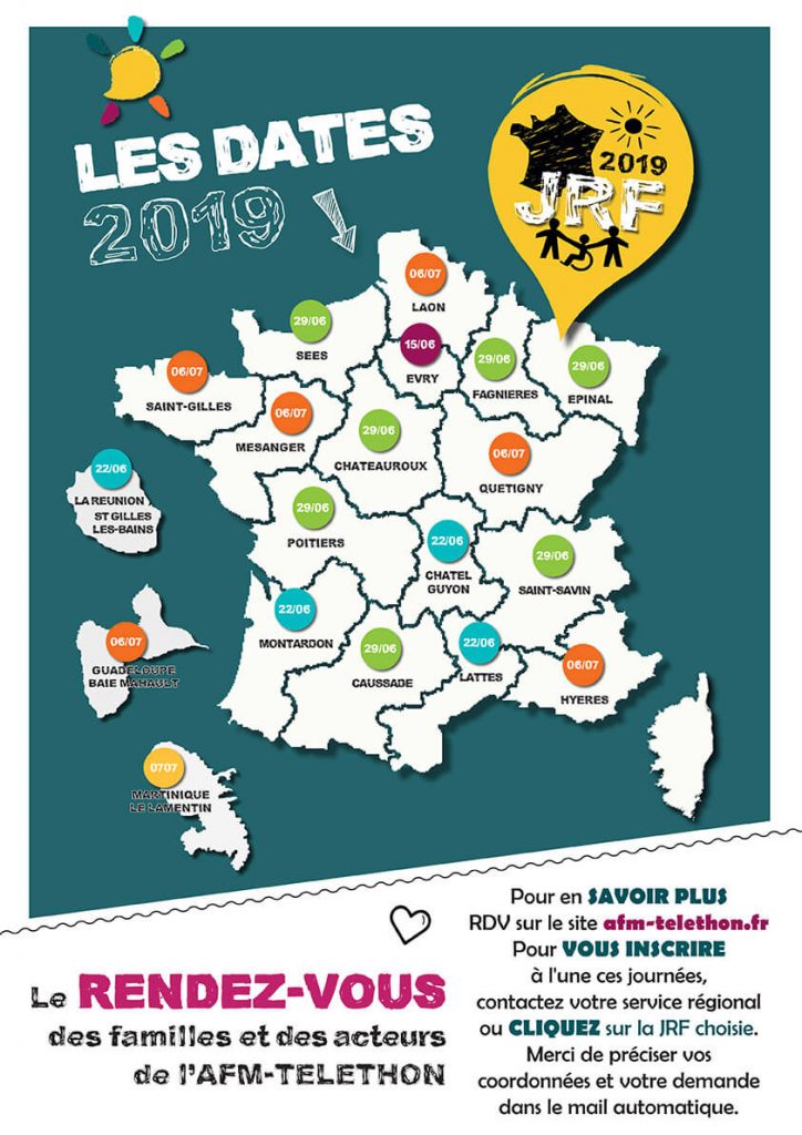 L’organisation des Journées régionales des Familles ayant été largement perturbée par la canicule des derniers jours, les journées prévues en juin ont pour la plupart été annulées. Ce samedi 6 juillet, c’est donc dans le Nord, en Bretagne, dans le Jura ou sur la Côte d’Azur que vous pouvez participer aux Journées régionales des Familles 2019 de l’AFM Téléthon.