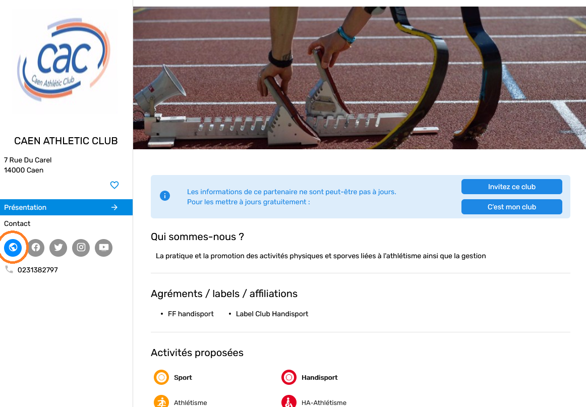 Une fois que vous trouvez un sport qui vous intéresse sur la carte, il vous suffit de cliquer dessus. Vous allez découvrir sa fiche (plus ou moins complétée) et allez pouvoir accéder au site officiel du club. Pour cela, il vous suffit de cliquer sur le logo entouré en orange dans la photo ci-dessous :