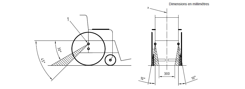 NOTE La figure I.1 présente les zones de point d’attache des fauteuils assurant l’efficacité d’un dispositif d’immobilisation par sangles à quatre points.