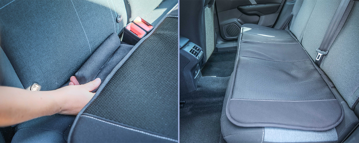 ➤ Installation : utilisation simple et rapide, il vous suffit de glisser les tubes de fixation (cf. photos ci-dessous) entre l’assise et le dossier de la banquette. Attention, en fonction de votre banquette, il se peut que les boucles des ceintures de sécurité soient recouvertes. Dans ce cas, vous pouvez tirer l’assise un peu plus vers l’avant de sorte à ce que les boucles restent visibles et utilisables (cf. photo ci-dessus).