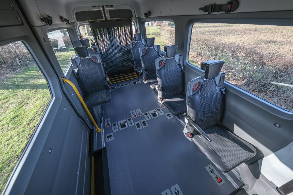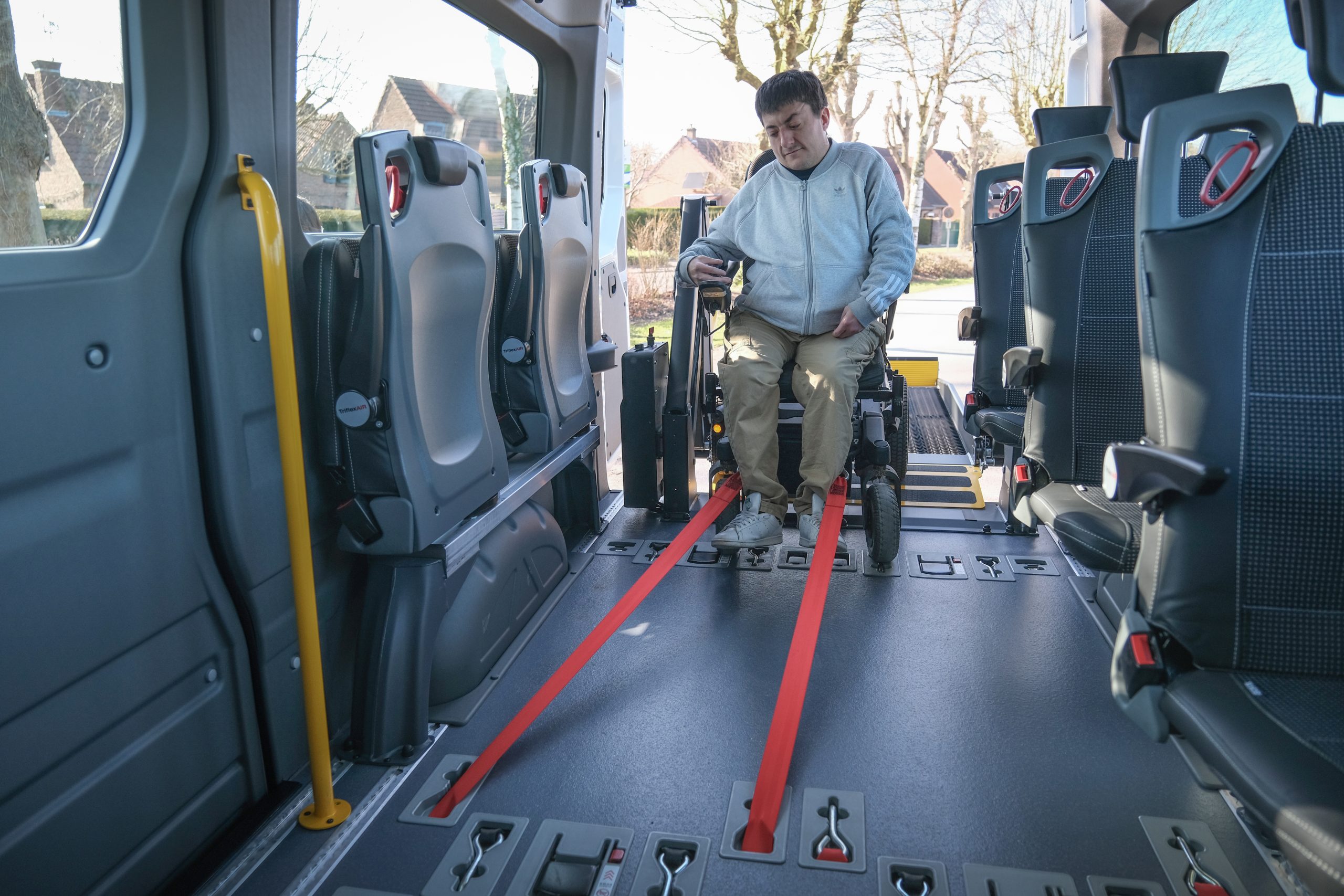 Le système d’arrimage directement intégré dans le plancher fait partie des points forts du véhicule. Ici, fini les sangles qui s’emmêlent ou traînent au sol : les sangles avant rallongées (rouges) et arrière (noires) sont toujours prêtes à l’emploi. Un seul geste suffit pour verrouiller ou déverrouiller l’arrimage. Le tout est rapide et sécurisé, un vrai plus pour les chauffeurs-accompagnateurs qui enchaînent les prises en charge.