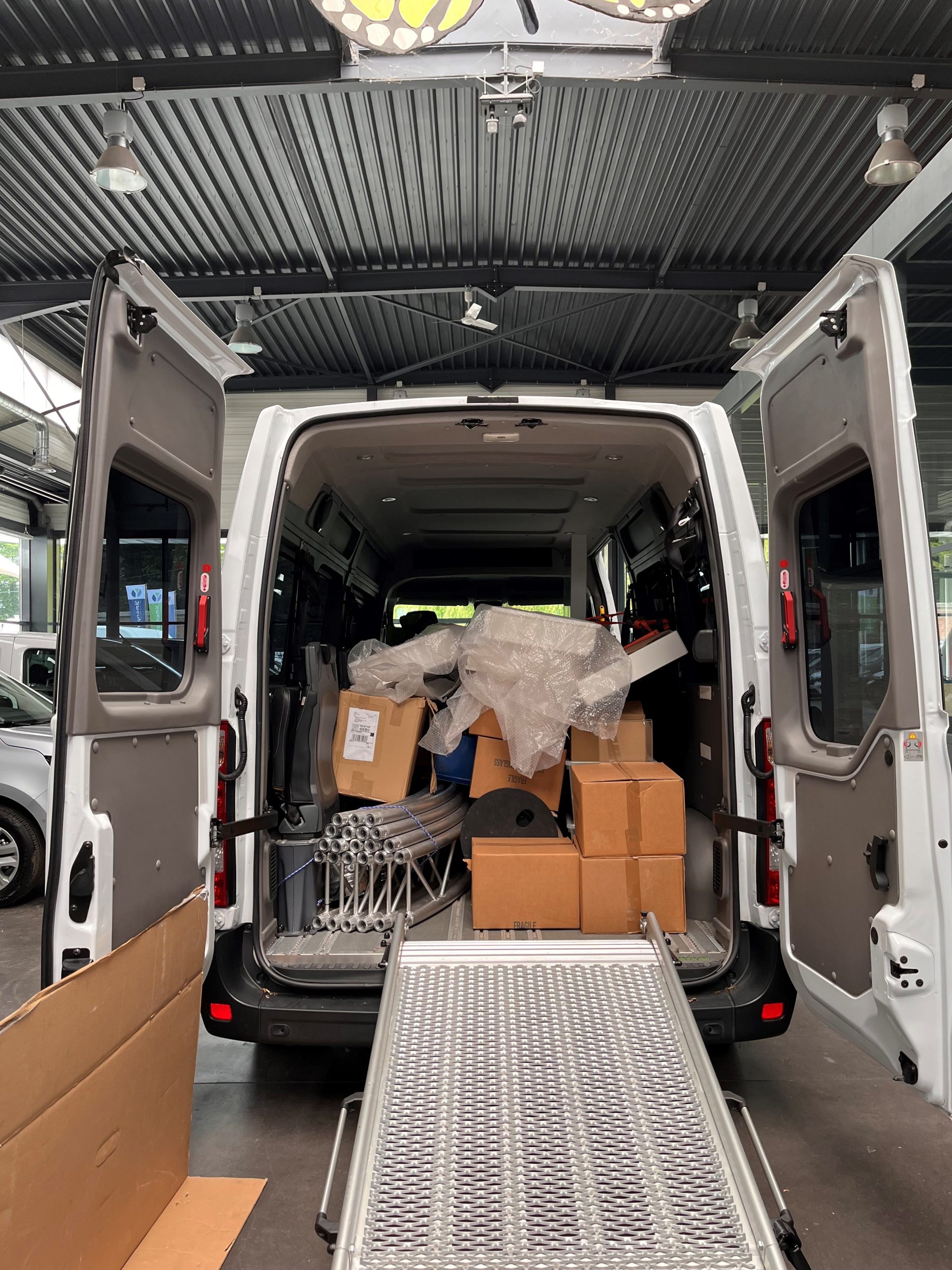 Nous vous avions partagé les clichés en Story Instagram, (re)découvrez l’avant/après du chargement de notre minibus pour son départ à Lyon :