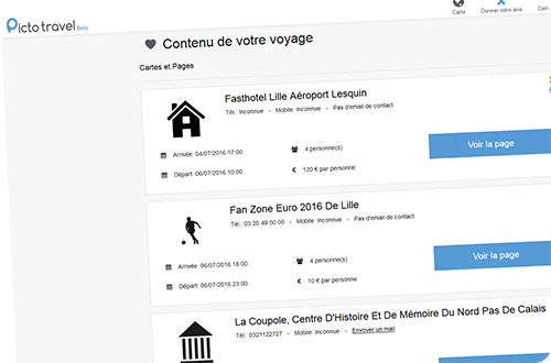 Pour organiser au mieux vos voyages, Picto travel vous permet de créer des carnets de voyages en ligne. Cette fonctionnalité très pratique invite à sauvegarder des destinations ou des activités dans un carnet en ligne, sur lequel vous pouvez indiquer vos dates d’arrivée et de départ, ainsi que le budget prévisionnel pour chaque étape. Le voyage est ainsi sauvegardé et accessible en ligne à tout moment depuis un ordinateur ou un smartphone, afin de retrouver ses adresses accessibles en quelques clics !