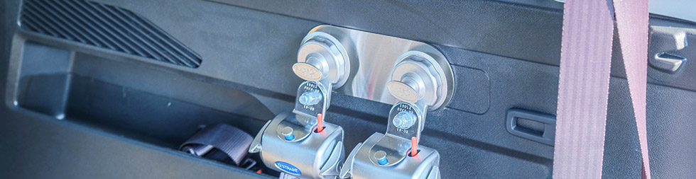 - Enrouleurs amovibles à blocage électrique : généralement utilisés pour l’arrimage de la partie avant du fauteuil roulant dans les véhicules aménagés avec un décaissement arrière. Les sangles sont suffisamment longues pour être fixées sur le fauteuil alors que ce dernier n’a pas encore franchi la rampe d’accès. Le blocage électrique permet ainsi de sécuriser la montée en évitant tout risque de reculer (avec un fauteuil manuel).