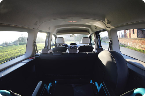 Une fois à l’intérieur, le passager en fauteuil roulant bénéficie d’un bel espace confortable et bien fini. La hauteur intérieure permet à la quasi totalité des personnes à mobilité réduite de rentrer, tout comme la largeur qui frise les records en terme d’accessibilité. Seule ombre au tableau à ce chapitre, la longueur du décaissement est un peu juste. Avec 122 cm, les fauteuils roulants les plus volumineux ne rentreront pas dans le Grand Kangoo ! Mais si on considère qu’il s’agit plutôt d’une voiture familiale, on peut imaginer que la plupart des passagers en fauteuil roulant qui y voyageront seront des enfants …