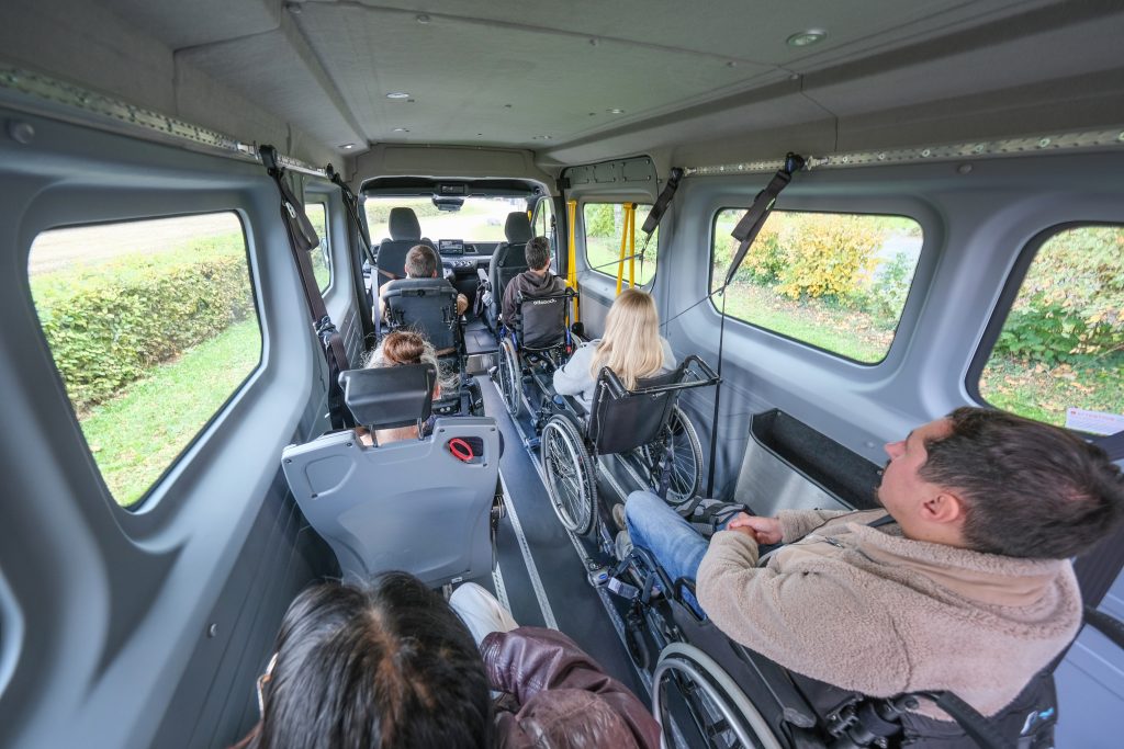 L’accès arrière se fait via une rampe manuelle, légère et fiable, qui ne nécessite aucun entretien particulier. Chaque fauteuil roulant est sécurisé par un système d’arrimage à quatre points (stocké dans un caisson dédié pour éviter qu’il ne traîne dans l’habitacle) ainsi qu’une ceinture de sécurité épaulière.