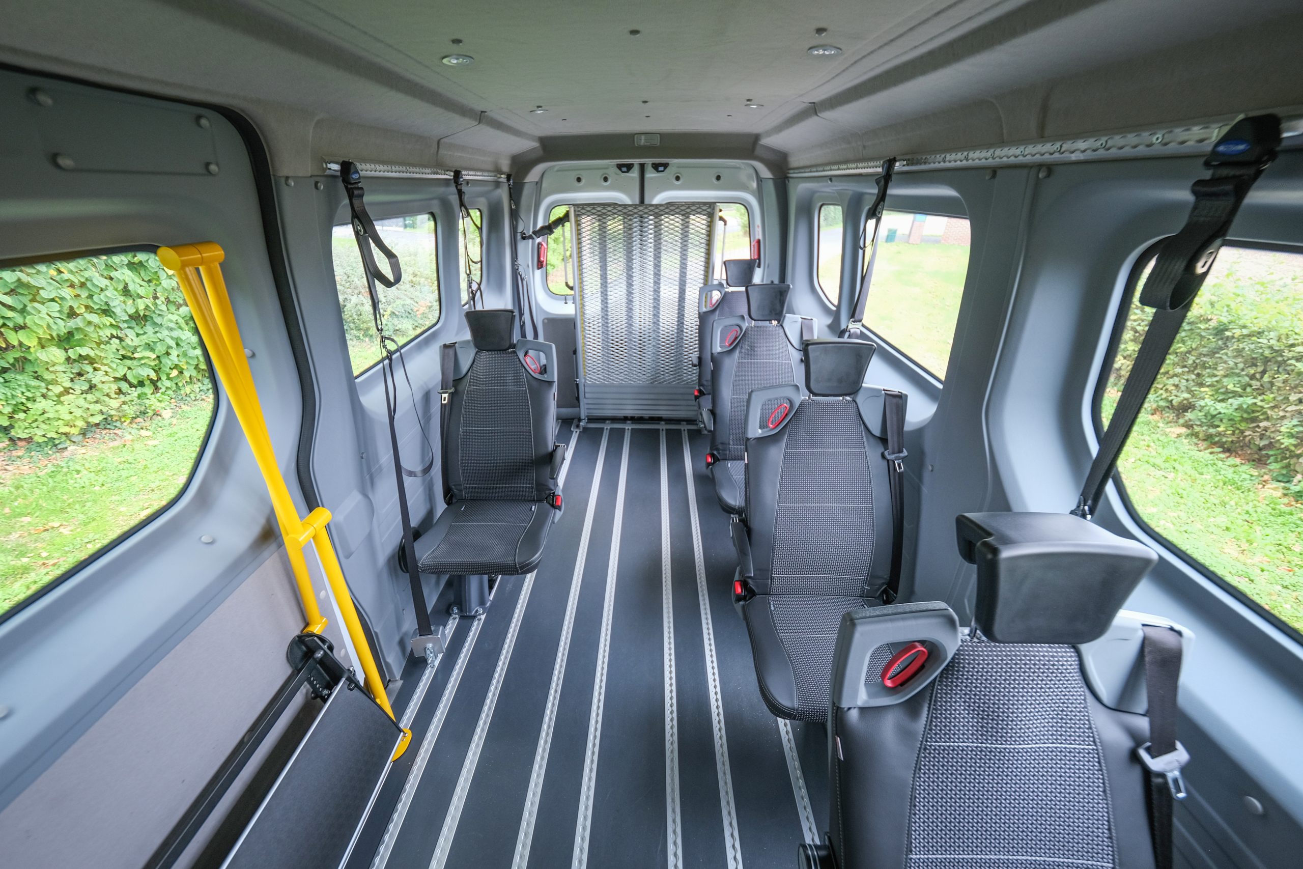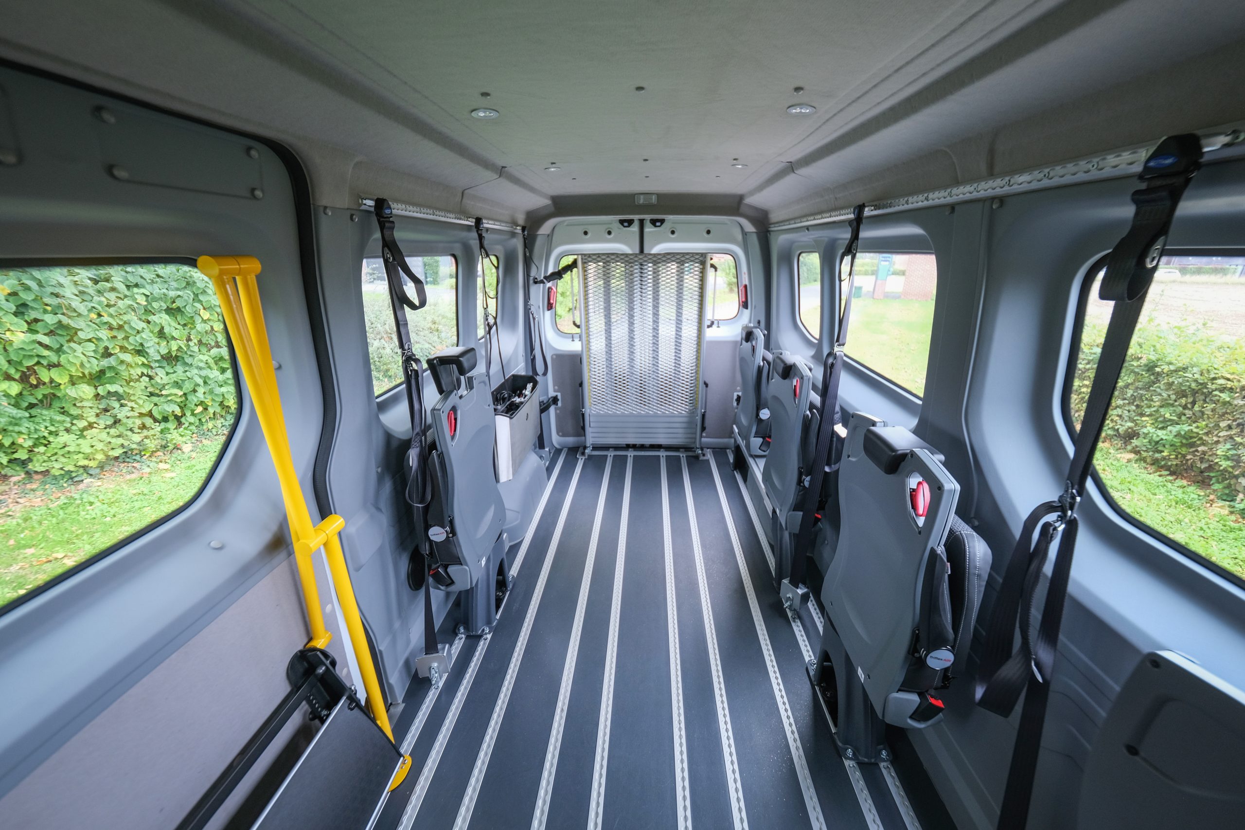 L’accès arrière se fait via une rampe manuelle, légère et fiable, qui ne nécessite aucun entretien particulier. Chaque fauteuil roulant est sécurisé par un système d’arrimage à quatre points (stocké dans un caisson dédié pour éviter qu’il ne traîne dans l’habitacle) ainsi qu’une ceinture de sécurité épaulière.