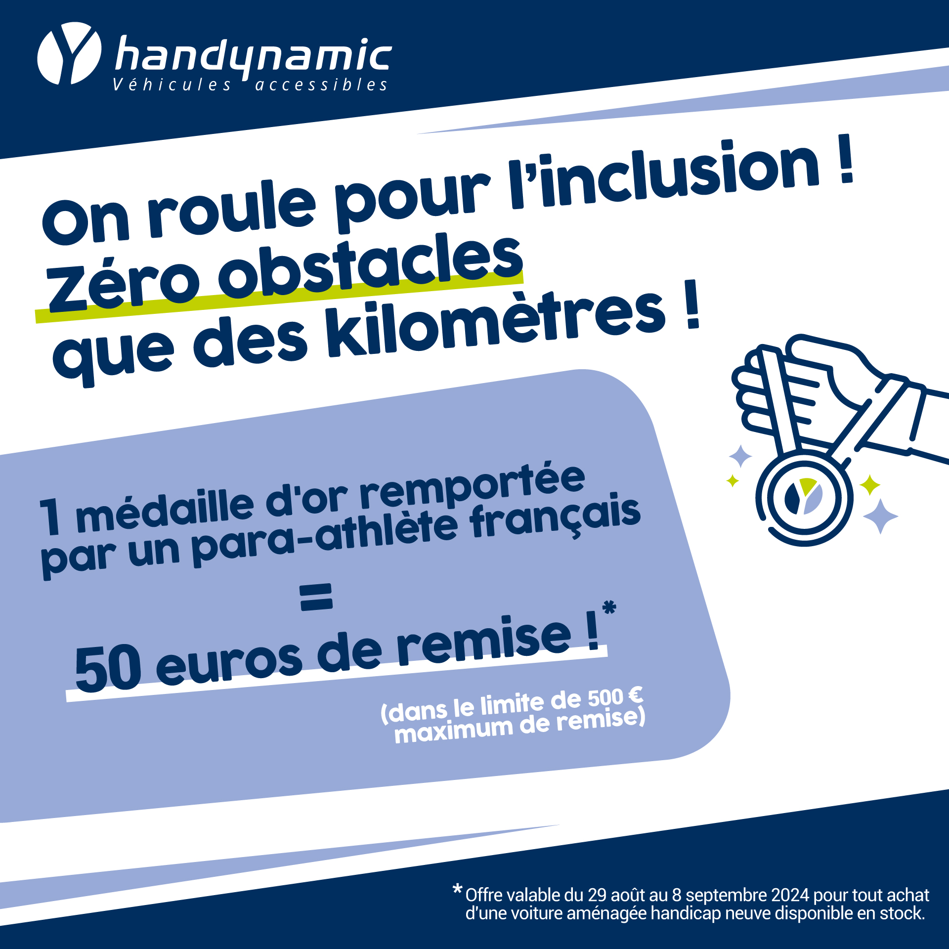 La mois d’août 2024 a bien évidemment été rythmé par les Jeux Paralympiques ! A cette occasion, Handynamic a lancé une offre spéciale : 1 médaille d’or remportée par un para-athlète français = 50 € de remise sur l’achat d’un véhicule aménagé handicap de la gamme Handynamic neuf et disponible en stock ! Soumise à condition, nous avons atteint les 500 € maximum de remise quelques jours seulement après le début des épreuves tant nos para-athlètes français ont excellé – et ce sont nos clients qui ont pu en profiter !