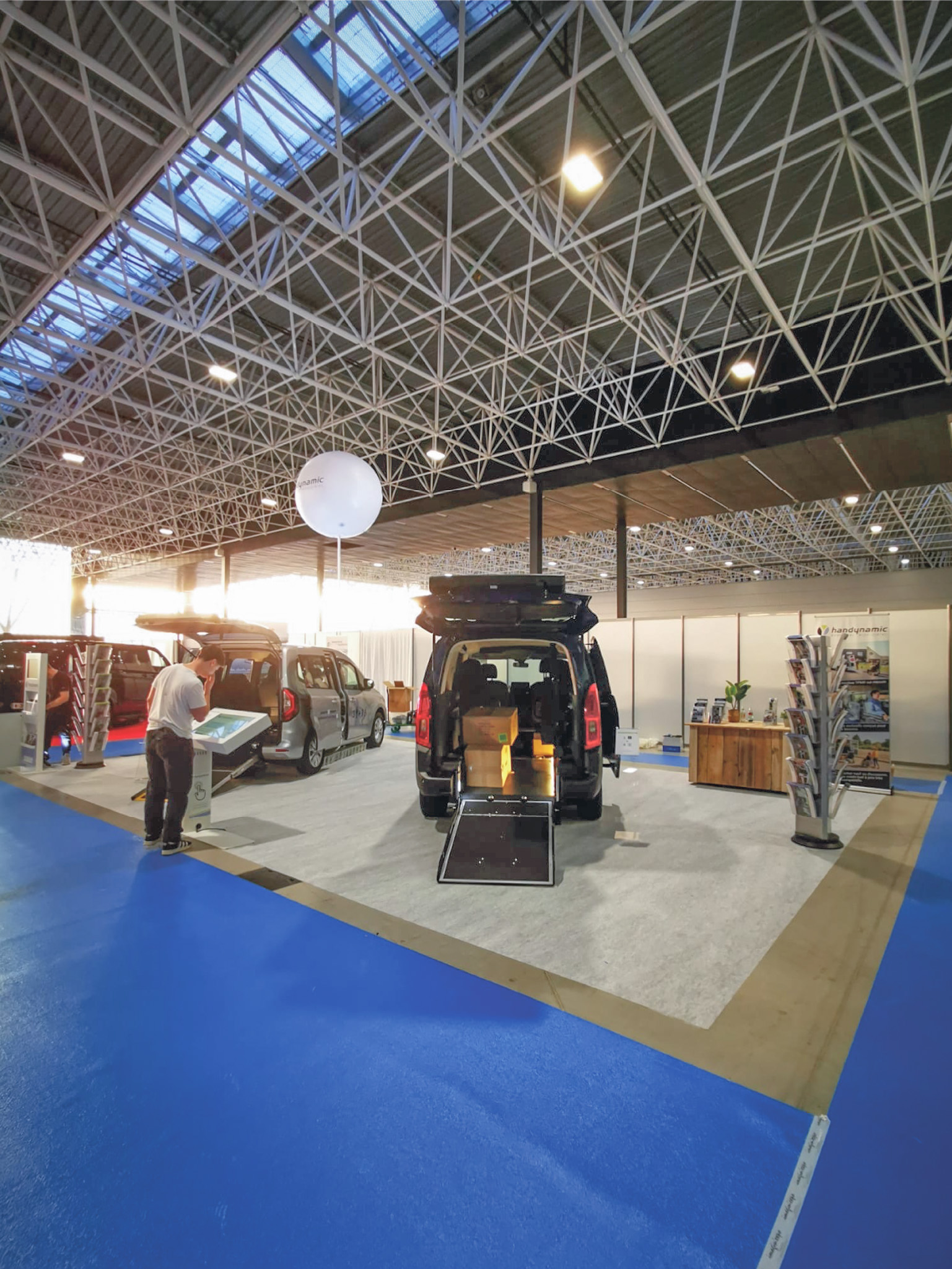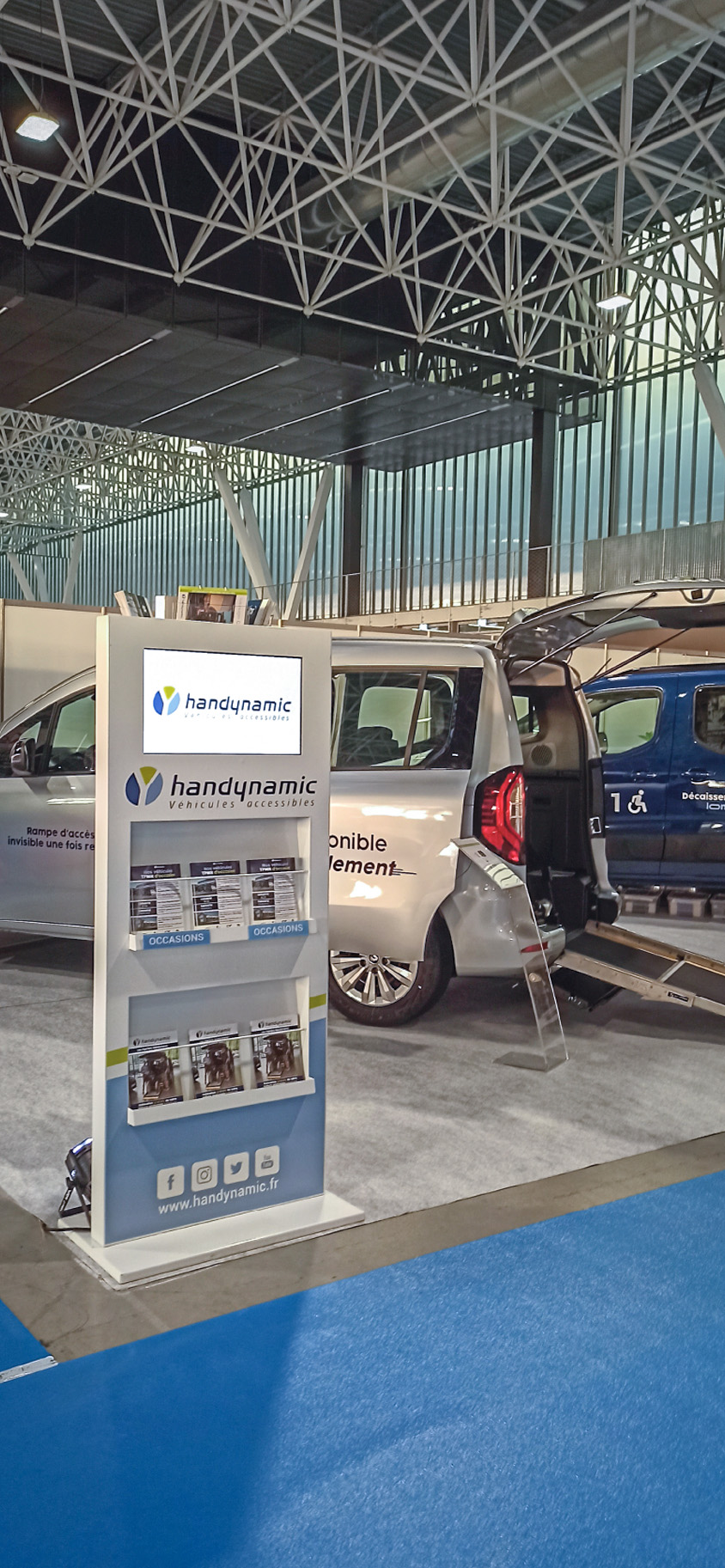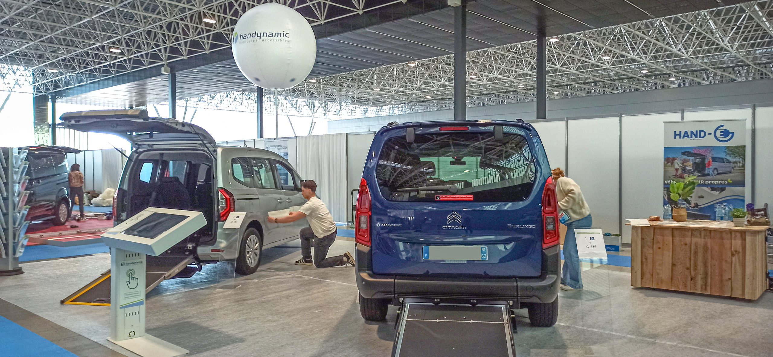 Mais dites-nous, il ne manquerait pas un ou deux éléments clés sur ce show-room improvisé ? Des véhicules accessibles, bien sûr ! Et ce sont nos collègues de l’agence Handynamic Lourdes, Amélie et Lucas, qui les ont ramenés en début d’après-midi.