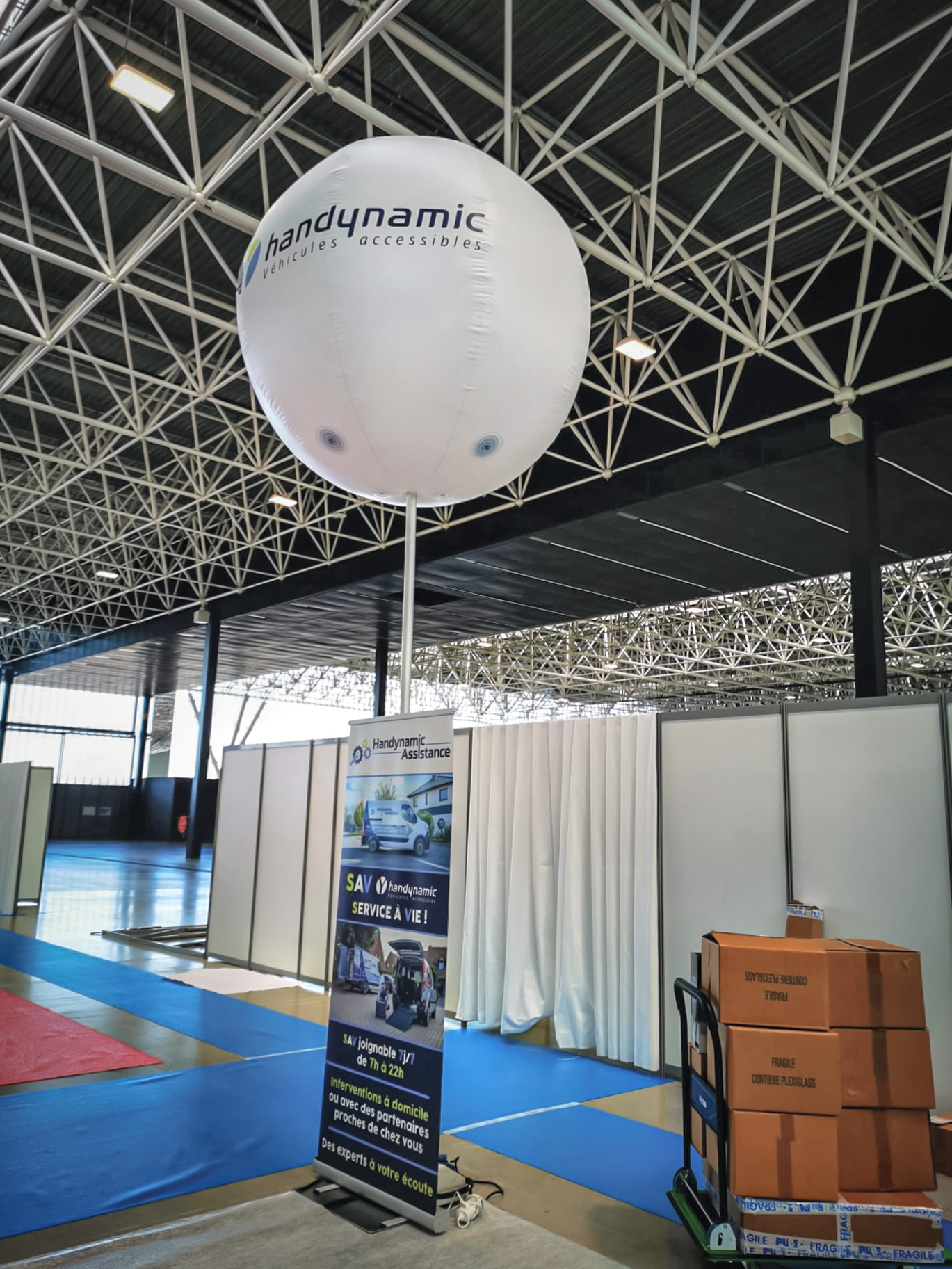 Une fois arrivés sur le salon et ravitaillés de viennoiseries et boissons généreusement offertes par l’organisateur (il leur fallait prendre des forces pour la suite), Mélanie et David ont commencé à installer notre stand. L’objectif : transformer l’emplacement B48 en mini-showroom Handynamic ! Pour ce faire, nous installons un grand comptoir, des tourniquets fournis de centaines de brochures et flyers, des kakémonos, une borne tactile et une borne télé, des plantes, … En plus, nous avions ramené dans nos valises une structure gonflable haute de 5 mètres et éclairée par des spots lumineux afin que les visiteurs puissent nous repérer de loin !
