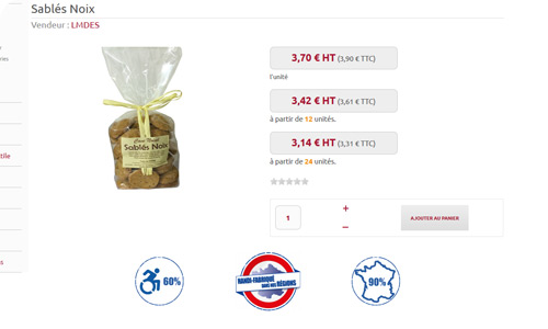 Chaque référence bénéficie du label « handi-fabriqué dans nos régions » afin de garantir la traçabilité du produit pour une totale transparence sur ses origines et une qualité optimale pour le consommateur final. En plus de ce label, 2 pictogrammes mettent en avant le pourcentage du produit fabriqué en France ainsi que celui correspondant au travail de personnes en situation de handicap.