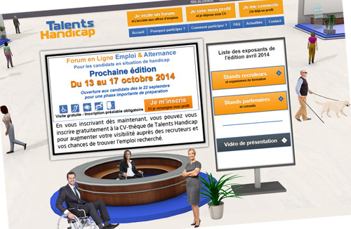 Avec l’évolution d’Internet, il est aujourd’hui possible d’organiser des forums entièrement en ligne, en 3D, mais dans lesquels les rencontres sont bien réelles. C’est bien l’objectif du forum Talents Handicap qui se déroulera du 13 au 17 octobre 2014. Comme son nom l’indique, ce forum de recrutement est exclusivement réservé aux personnes en situation de handicap, et mobilise des entreprises de niveau national et leurs antennes locales.
