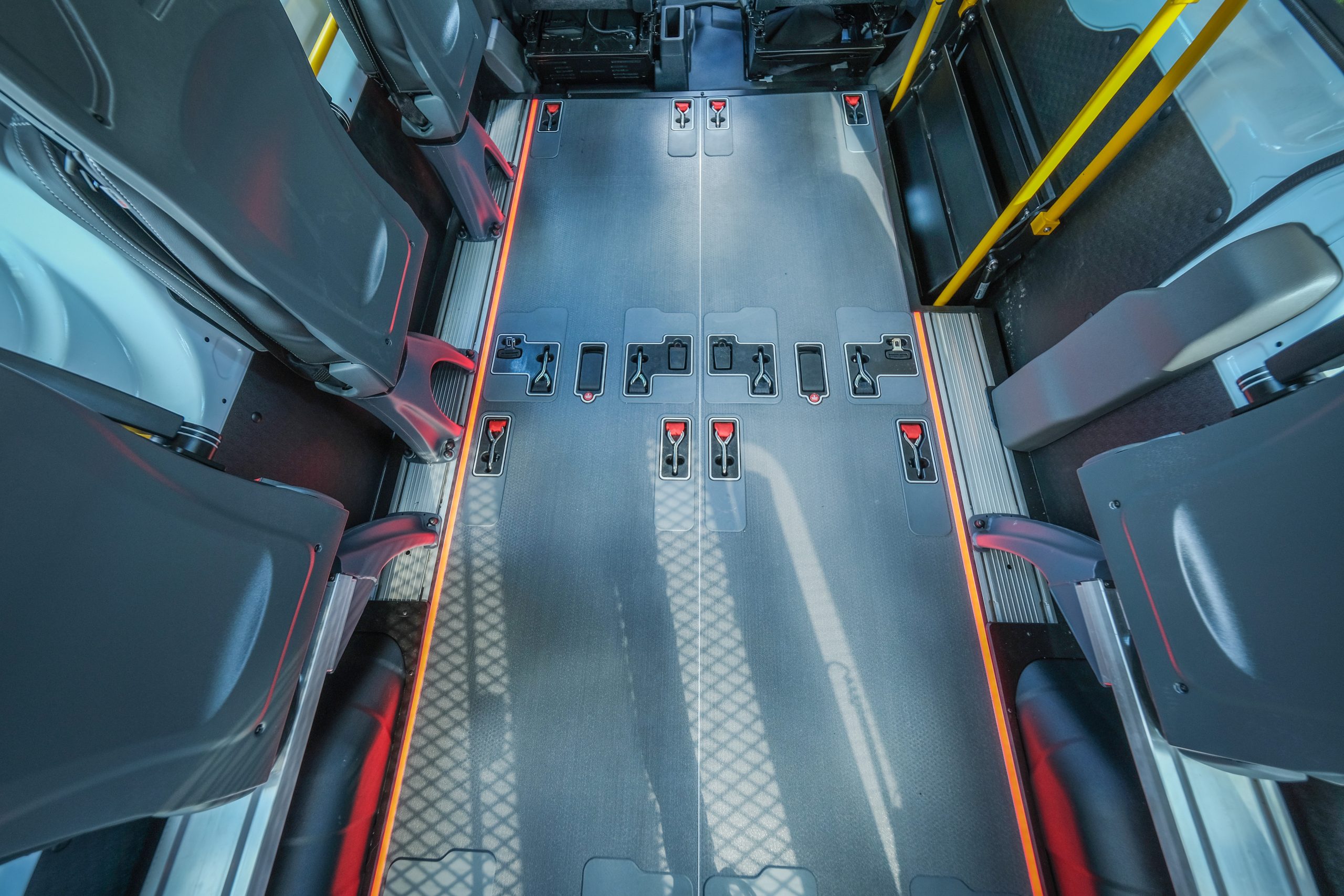 Grande nouveauté ici cependant, ce minibus est le premier à être équipé de la version 2.0 du plancher Triflex Easy (composé d’une structure aluminium et de panneaux composites antidérapants) ! Découvrez ici des bandes LED lumineuses présentes de chaque côté du plancher qui peut de plus accueillir jusqu’à 3 fauteuils roulants. L’arrimage est facilité avec de nouveaux boutons et manettes permettant d’optimiser les manipulations du chauffeur-accompagnateur.