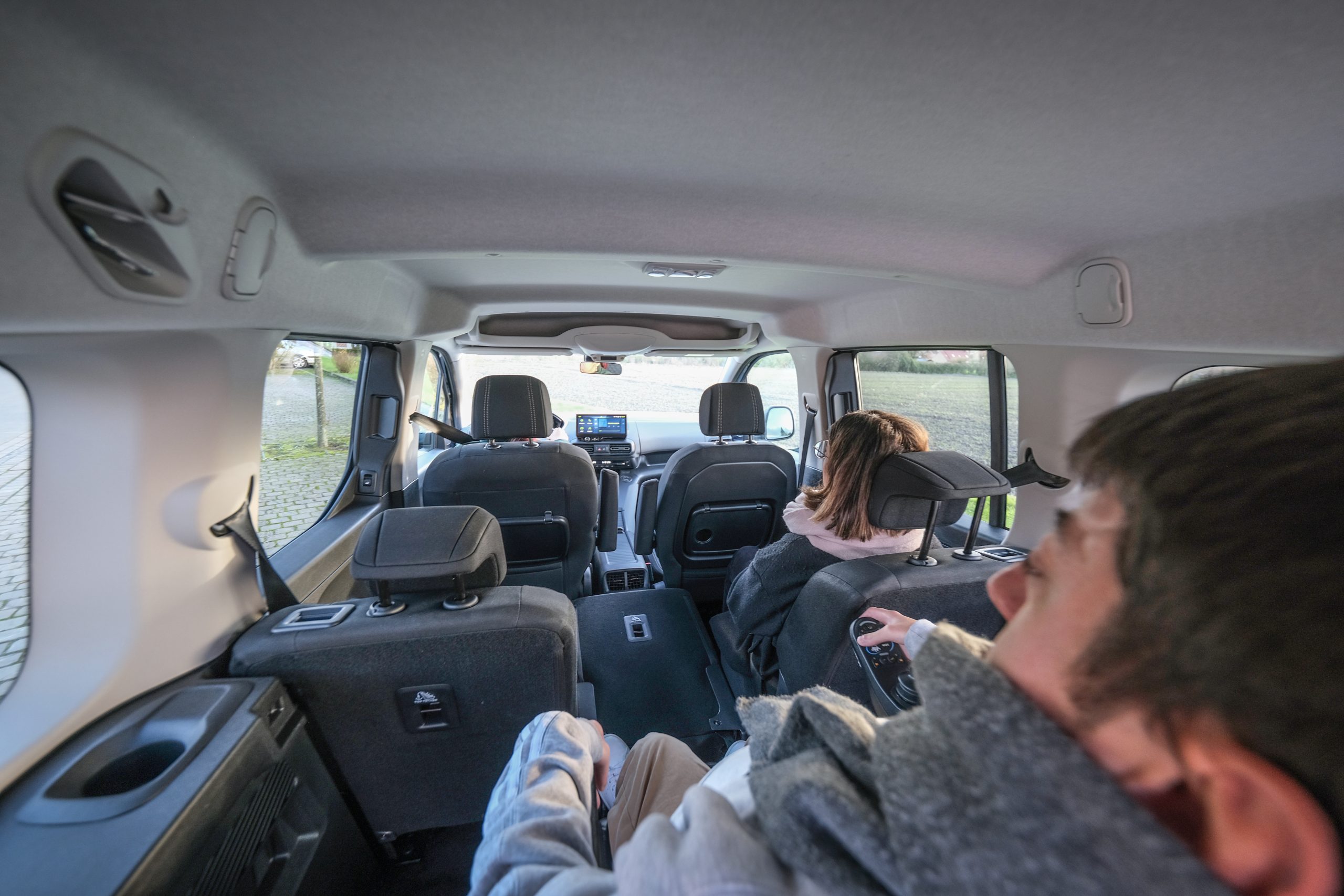 Equipé de l’aménagement handicap Maxi Xtra HappyAccess, le nouveau Peugeot Rifter rallongé permet à un passager en fauteuil roulant – même électrique imposant – de voyager proche des passagers installés sur les sièges individuels d’origine en rang 2.