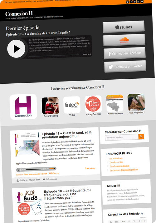 Depuis le début de l’année, vous avez vu apparaître sur nos pages Facebook, Twitter et Google+ des liens vers le podcast Connexion H. Si vous n’avez pas suivi, cette émission audio en ligne traite le thème du handicap toutes les semaines avec un zoom sur l’actualité et des dossiers de fond dans tous les domaines, de l’autisme à la mobilité, en passant par les aides techniques, les nouvelles technologies, … Et pour mieux vous y retrouver, Connexion H s’est doté d’un tout nouveau site Internet. Présentation …
