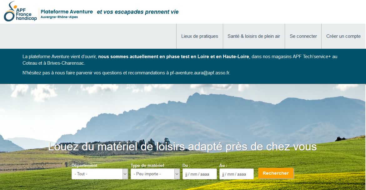 Portée par APF Développement AuRA sur la région Auvergne-Rhône-Alpes, cette plateforme s’adresse à toutes les personnes ayant une mobilité réduite ainsi qu’aux organisations professionnelles proposant des activités sportives et de loisirs plein air et adaptées, qui peuvent mettre en location leur propre matériel lorsqu’il n’est pas utilisé.
