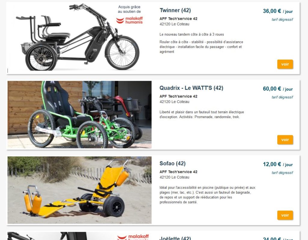 Le site Plateforme Aventure est plutôt bien fait : en fonction de votre localisation, du type de matériel et des dates souhaitées, une liste des équipements disponibles s’affiche. Les prix débutent à partir d’une dizaine d’euros la journée. Vous cliquez ensuite sur celui de votre choix et vous accédez à sa fiche détaillée. Utilisation, mode d’emploi, accompagnement nécessaire, âge requis, type de handicap, dimensions, informations techniques, documents nécessaires, poids… Tout y est !