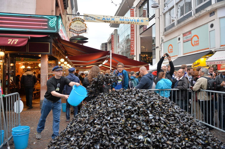 Et une Braderie de Lille ne se vit pas sans savourer un bon plat de moules-frites. Cette tradition remonte à de nombreuses années, et occasionne une compétition entre les restaurants qui essayent de créer le plus grand tas de coquilles de moules vides sur une des places de la ville. C’est toujours une curiosité à voir et un plaisir de contribuer à faire monter le tas !