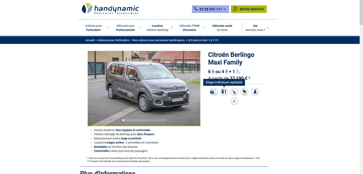 Depuis le Mercredi 29 septembre 2021, notre nouvelle version est en ligne. Résultats : dès la page d’accueil (cf. rapide aperçu sur la 1ère image), vous avez accès à toutes les informations avec un nombre de clics limité : de quoi nous contacter, obtenir un devis gratuitement, ou accéder au menu pour d’autres renseignements. Ce dernier (cf. 2ème image) est particulièrement clair et détaillé pour vous aider au mieux dans votre recherche, et chaque page « véhicule » (3ème image) est aussi visuelle et descriptive que possible : caractéristiques clés, pictogrammes, photos, dimensions, vidéo…