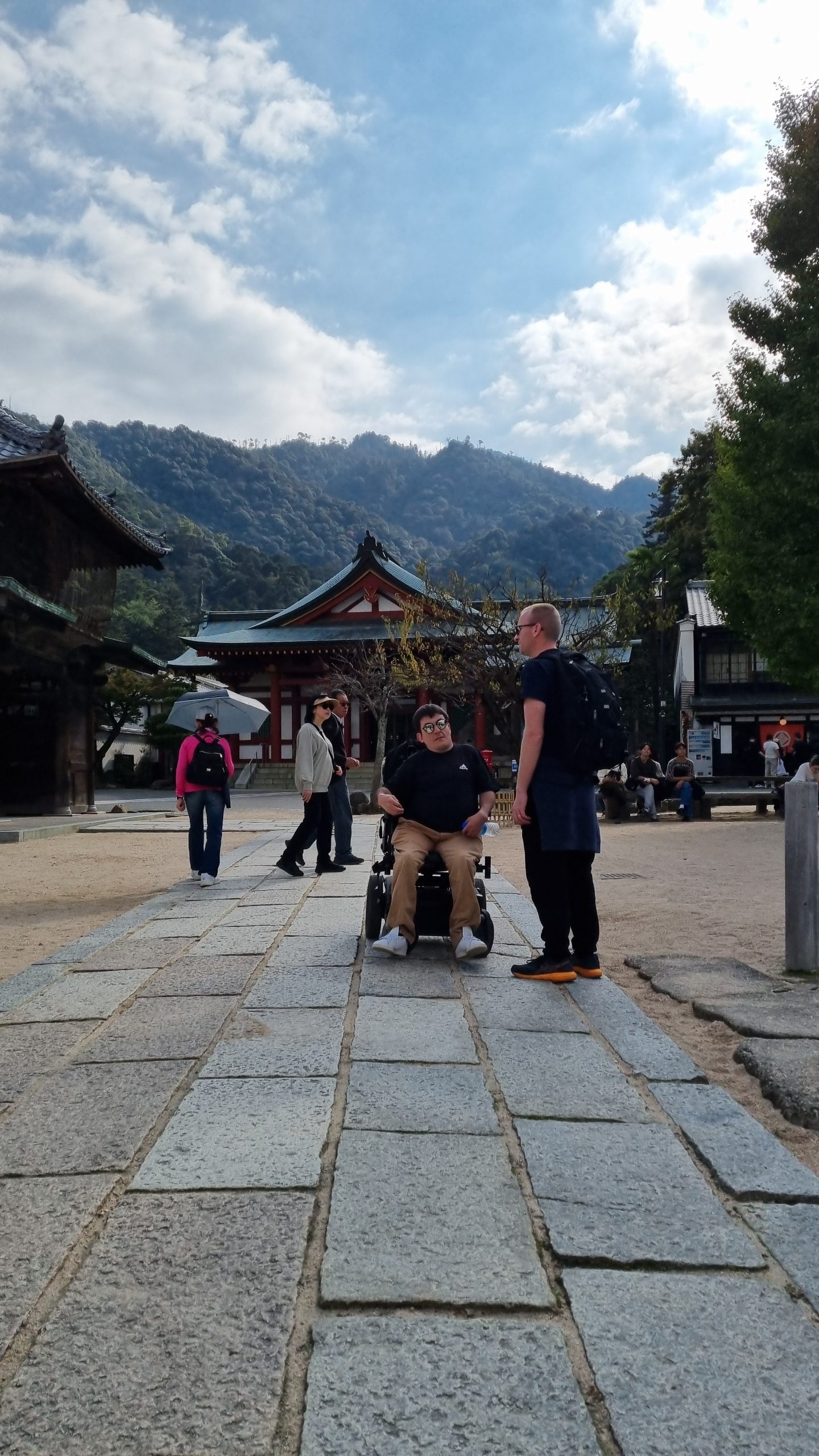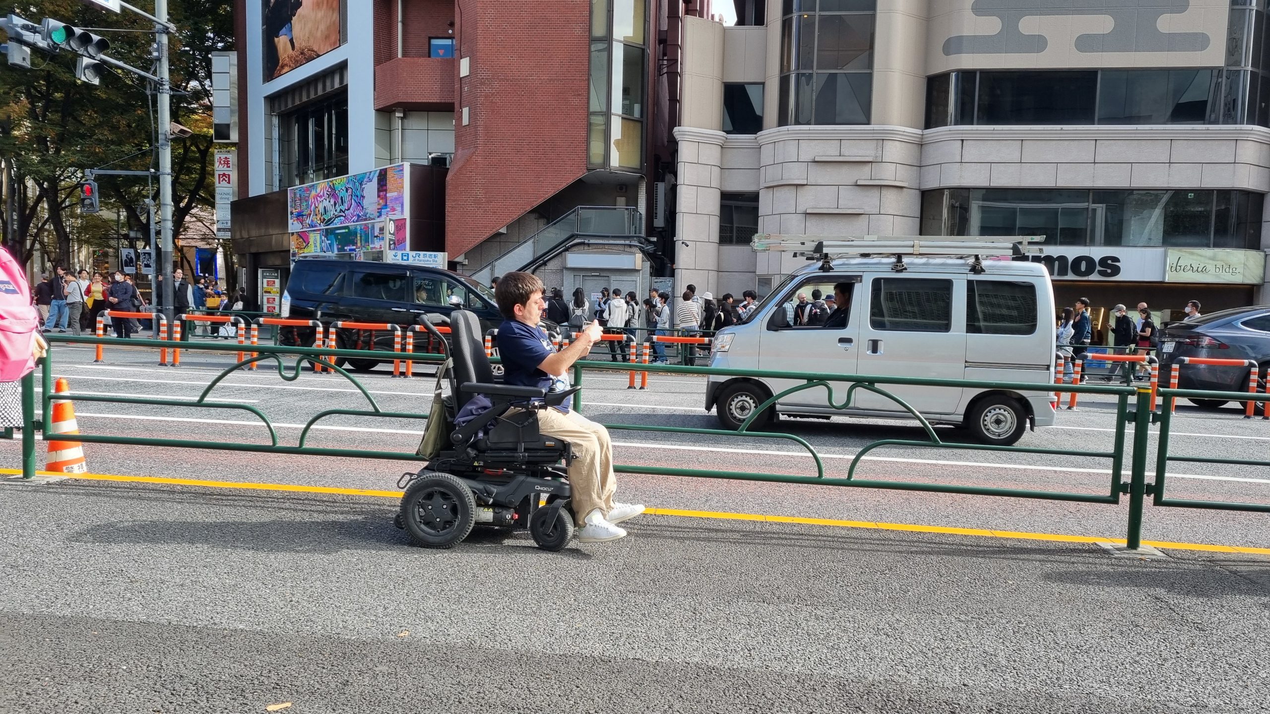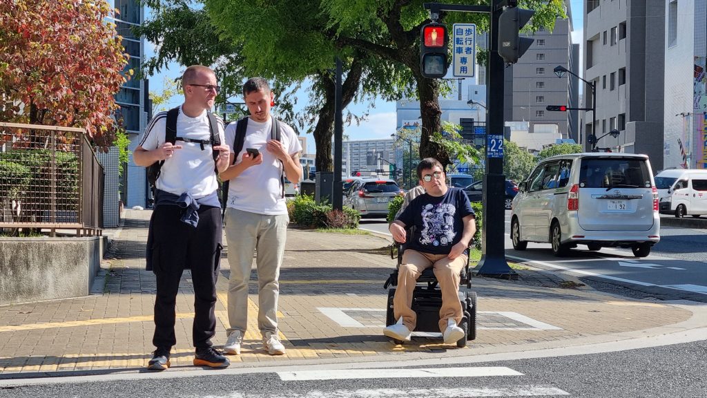 Côté interactions sociales, le ressenti a aussi été très positif. À aucun moment Valentin ou Olivier ne se sont sentis regardés de manière intrusive. Contrairement à ce qui peut arriver en France, les Japonais observent peu dans la rue, ou en tout cas avec beaucoup de discrétion. L’équipement d’Olivier, notamment la roue additionnelle avant de son fauteuil roulant manuel, a certes attiré quelques regards curieux, mais sans insistance.