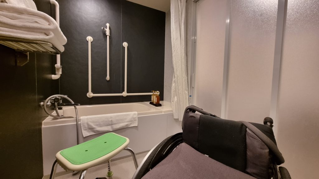 Autre point de vigilance : si les salles de bain sont presque toujours équipées de douches à l’italienne, le siège de douche, lui, n’est pas systématiquement inclus. Olivier et Valentin ont dû en faire plusieurs fois la demande, et certains hôtels n’en disposaient même pas. C’est là que réside le vrai problème : une chambre PMR devrait toujours être équipée d’un siège de douche. Cela peut sembler être un simple détail, mais pour une personne en fauteuil roulant, c’est un élément indispensable pour pouvoir se laver de façon autonome et en toute sécurité !