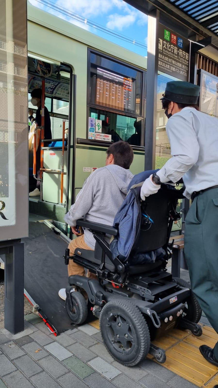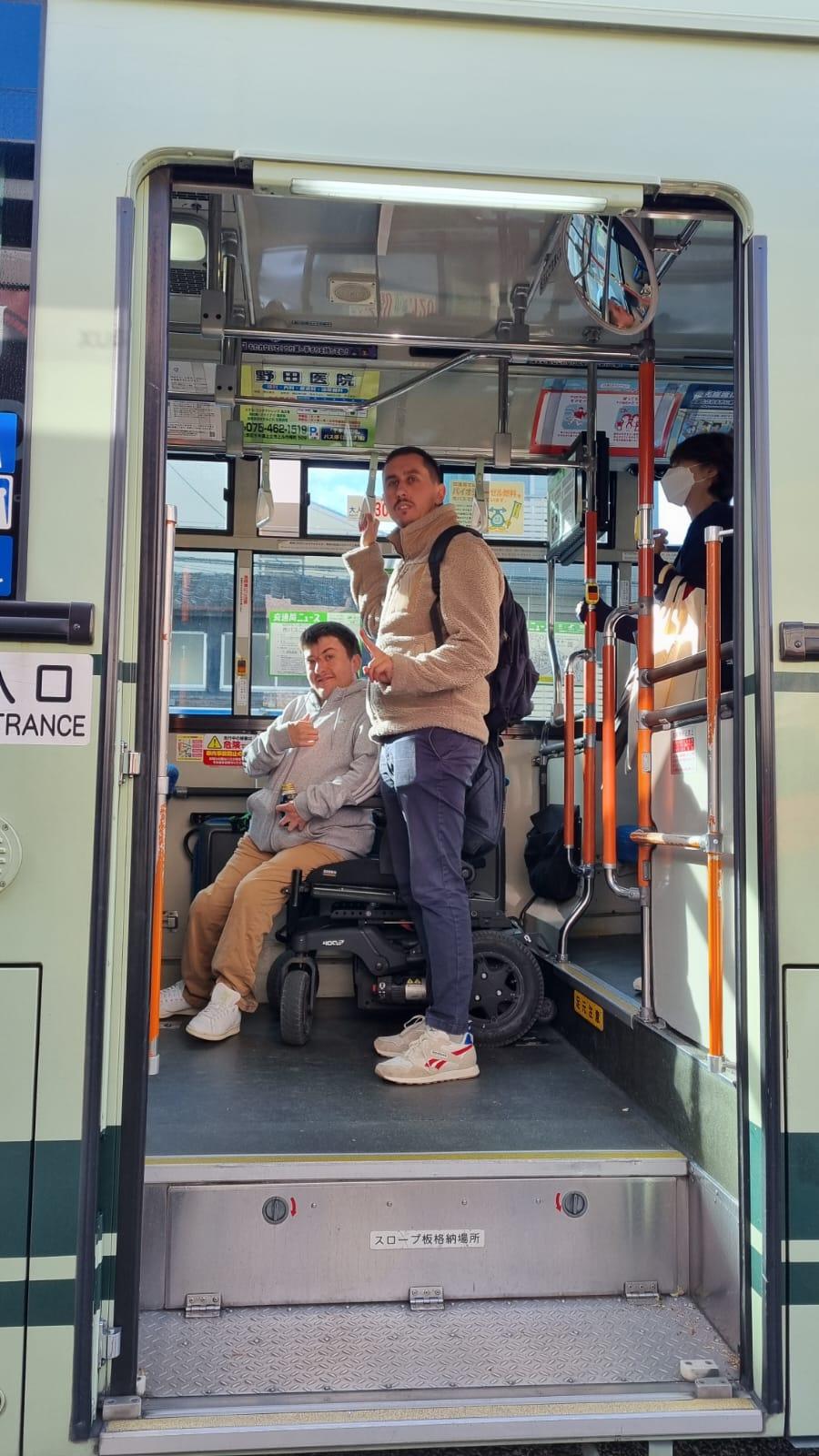 L’accessibilité varie, mais reste globalement bien pensée. Dans les bus, les conducteurs descendent systématiquement de leur poste pour déployer une rampe manuelle en métal et aider à l’embarquement des passagers en fauteuil. Une fois à bord, ils prennent le temps d’installer la personne (mais il est à noter que l’arrimage de sécurité à quatre points est souvent négligé, au profit d’une simple cale ou parfois même des seuls freins du fauteuil roulant). Ce niveau de service, très humain et rigoureux, a marqué les esprits de nos Handynamiciens. De plus, à bord du Shinkansen, les personnes en fauteuil roulant ont le choix entre deux emplacements PMR : l’un standard, prévu dans le wagon, et l’autre plus isolé, situé entre deux voitures, qui permet de voyager en position allongée. Les toilettes PMR sont séparées de celles des autres voyageurs et très bien conçues.